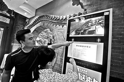 买回家的食品可以检测,外出就餐的餐厅也在升级改造。8月18日中午,北青报记者来到簋街一家餐厅,一进门就看到一个高约两米的显示屏。正在排位的顾客对这个刚刚启用的显示屏很感兴趣,当得知显示屏上实时播放着的正是该餐厅后厨的情况时,顾客显得很惊讶:“后厨都公开了?”