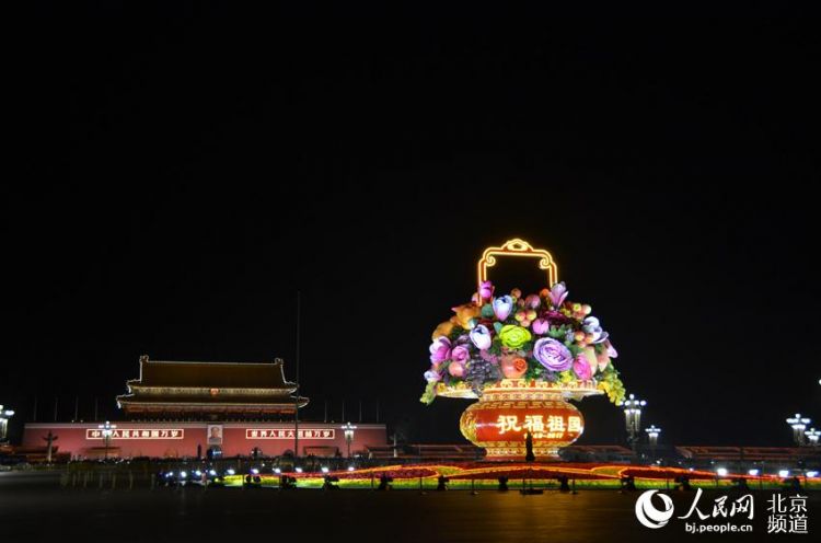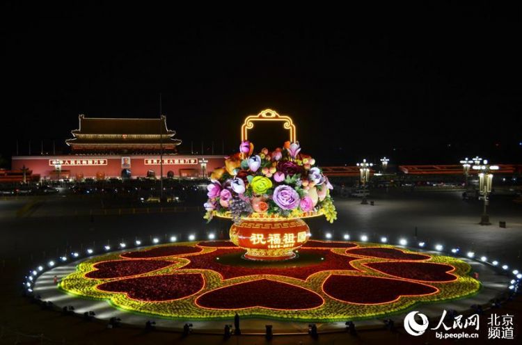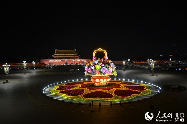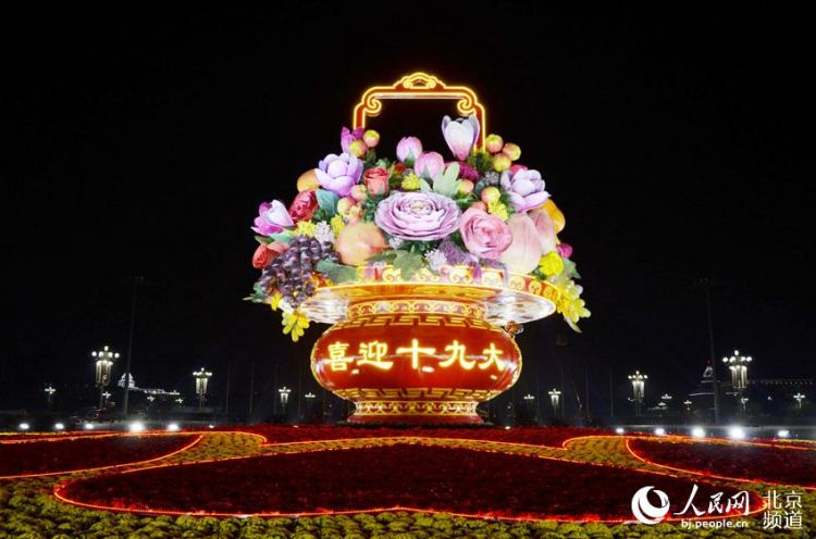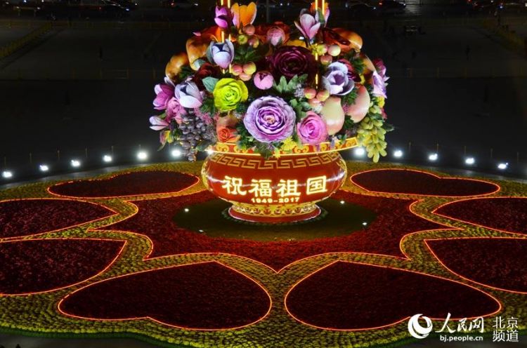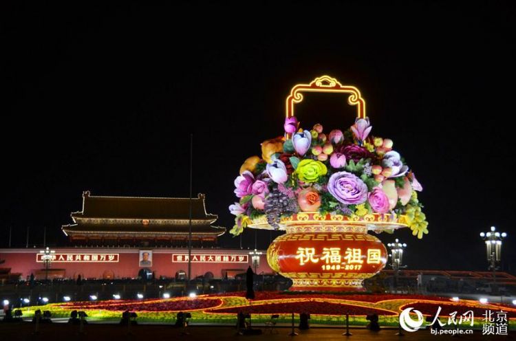 昨晚,天安门广场中心祝福祖国花篮正式开启夜景照明,为欢度国庆节、迎接十九大营造出更加喜庆热烈的气氛。人民网尹星云 摄