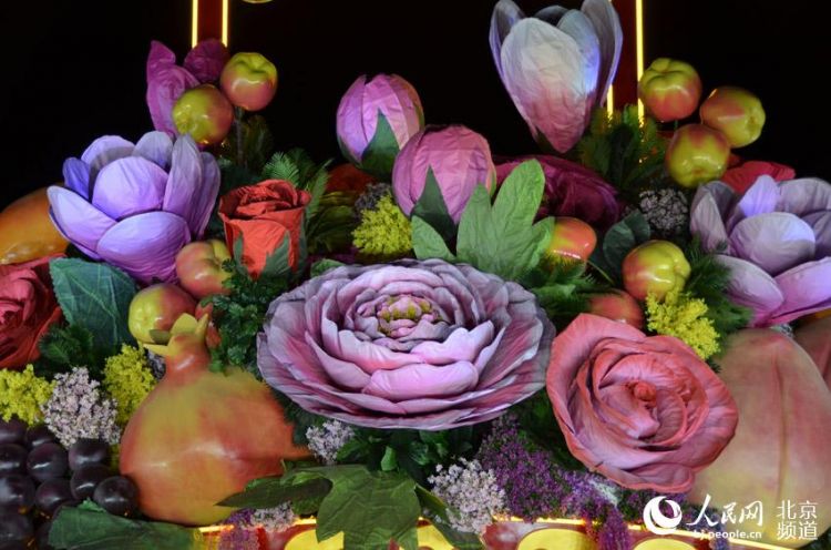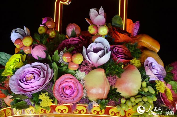在灯光的照射中,大花果篮中玲珑的海棠、艳红的石榴、金灿灿的柿子,与牡丹、月季、玉兰交相辉映,成为广场上最靓丽的风景。人民网尹星云 摄