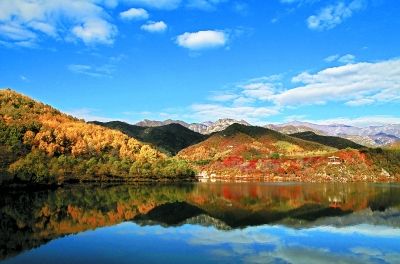 玉渡山,雪山与彩林倒映水中。司达 摄