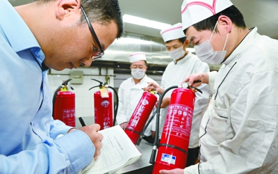 前天,市政路桥养护集团市政工程七处消防安全员在刚刚升级改造的职工食堂里,严格检查消防设施,排除安全隐患,让员工安全放心用餐,并训导厨师们增强用火安全意识,用好火,管好火。本报记者 戴冰摄