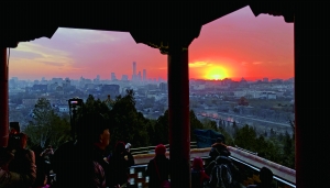 早晨7点10分,景山万春亭,东南天空布满粉红色的朝霞,在霞光的映衬下,CBD建筑群的轮廓清晰可见。很多摄影爱好者兴奋地按下相机快门,记录下这一美丽而难得的时刻。