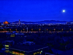 日落时分,从北四环惠新西桥上向西望去,远山城市楼房的轮廓叠加在一起。在晚高峰的车流灯光与半空中路灯上下交错的点缀下,一对亲昵的父子成为冬日里温暖的画面。