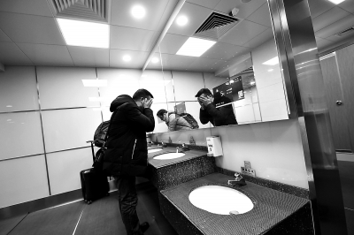 昨天,北京南站已经投入使用的“升级版”卫生间整洁干净,新的洗手台玻璃镜上还有电子屏幕,为顾客显示天气温度等信息。本报记者 和冠欣摄