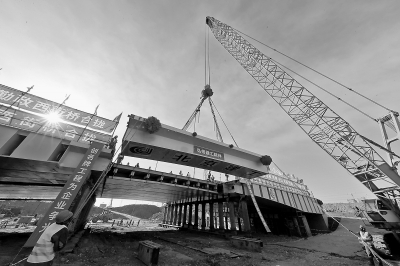 据介绍,桥梁从去年12月19日开始吊装施工,针对场地狭窄、超大构件多、冬季施工等挑战,项目团队通过采取钢构件现场加工改为工厂加工、现浇结构模板木模改为钢模等一系列措施,降低工程材料和周转材料的占地面积。本报特约摄影 王建忠