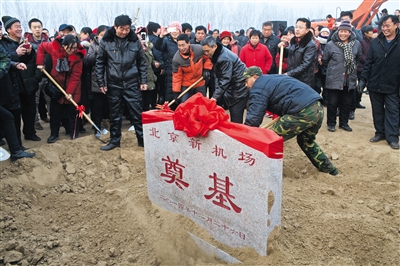 2014年12月26日,北京新机场工程正式开工,当地村民拿起铲子将奠基石周边的土添上。新京报记者 周岗峰 摄