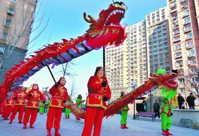 昨天,石景山区古城街道现代嘉园西区居民“花会闹春”。本报记者 吴镝摄