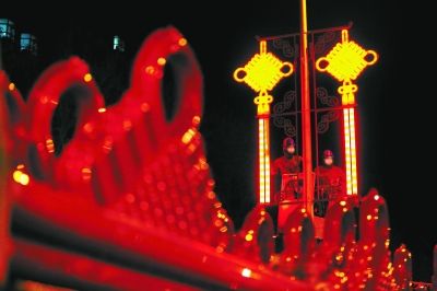 今年,王德建和同事们的任务更重了,因为灯饰布置的范围扩大了,不只是十里长街,建,向东到国贸桥、复兴门向西至新兴桥道路南北两侧也要挂上“中国结”,北海大桥桥区道路两侧还要挂上大红灯笼。