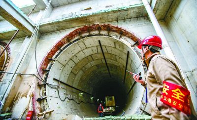 昨天,一名施工人员从位于大兴的新机场线在建隧道口走过。