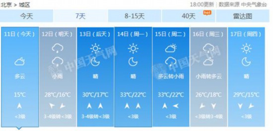 预计今天(12日)白天,京城有分散性雷阵雨,局地可能出现雷暴大风。明天开始,京城开启“酷热模式”,尤其是下周一、周二,,气温将攀上33℃,需注意补水防晒。