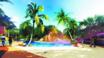 海之蓝是中庭水景区,展现海南一流海岸之美。穿过下沉式的弧形廊架,在场地,区域下沉处理,形成中庭水景。映入游客眼帘的是郁郁葱葱的景观岛屿,在水体对岸放置南天一柱景石小品,结合两岸的椰子树,营造出,海岛风情的景观氛围。