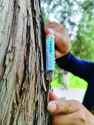 过了芒种,公园里的花草树木进入了防虫治虫的关键时期。昨天在紫竹院公园,北京园林科研院的工作人员抱着一个鞋盒大小的塑料盒子,里面有近百支食指粗细的试管。工作人员找到一株柏树,拔掉棉塞,利用斑驳的树皮将小瓶倒挂上(见图)。很快,近百头小蚂蚁一样的肿腿蜂悄悄钻出来,瞬间就消失在了树皮缝隙里。据悉,这些肿腿蜂搜寻能力极强,会很快找到天牛的幼虫,然后利用针刺麻痹,将卵产在它身上,一次可产卵上百粒,待幼虫孵化后就以天牛幼虫为食,直至吃光它,这一过程大概为30天。花绒寄甲的杀虫原理与肿腿蜂一样,只是它们的个头更大一些,因此针对的是体型更大的天牛品种。