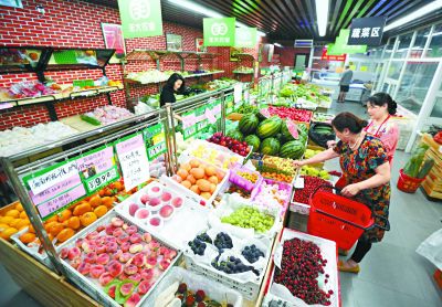 社区居民在百万庄“便民岛”挑选水果蔬菜。