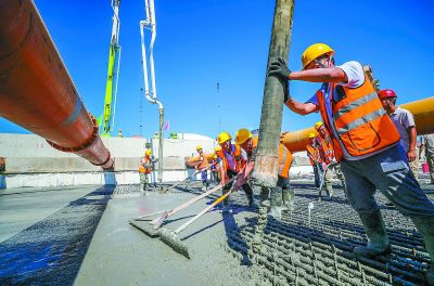 昨天,在新机场线磁各庄车站施工现场,工人正在进行混凝土浇筑。 本报记者 武亦彬摄