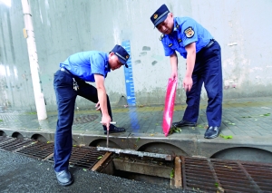 朝阳区来广营城管执法队开展24小时巡查执法行动。在辖区易积水路段,城管队员及时清理杂物,避免堵塞下水道。北京晨报记者 邹乐/文 ,摄影记者 吴宁/摄