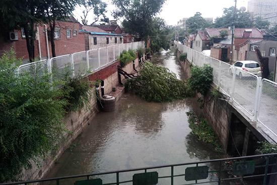 “早上我巡查时发现这里的树倒进了九子河,我赶紧通知了街道绿化办,请求解决。”7月16日早上6时,北京市丰台区长辛店街道东南街社区党委书记刘杰在巡查时发现九子河河堤的一棵榆树因大雨导致树干折断,整棵树倾倒至河道内,堵塞了排水系统。