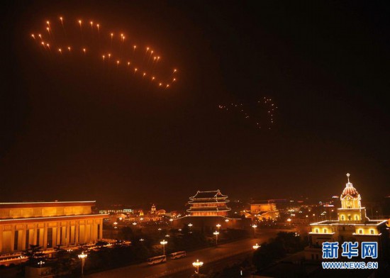 这是2008年8月8日拍摄的天安门广场上空燃放的北京奥运会开幕式焰火《历史足迹》上的“脚印”。