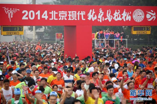 这是2014年10月19日,选手们在2014年北京马拉松赛中出发。 新华社记者李明摄