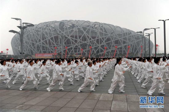 这是2009年8月8日,34000人在“鸟巢”前进行太极拳表演,庆祝全国,“全民健身日”。 新华社记者郭勇摄