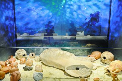 被蓝色“包裹”的神武门展厅,原本威严的,气质一下子柔和起来。船体残骸、生活用品、大理石雕塑、青铜雕塑、玻璃器皿、运输用的陶瓶、沙发构件等展品,向人们展示着古希腊文明的方方面面,涉及到航海、经济、艺术、宗教、体育等领域。
