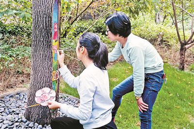 但也有居民担心,在树干上作画,绘画颜料会不会腐蚀树木?为此,记者咨询了负责林肯公园绿化景观工程工作的北京和景园林绿化有限公司的李经理。他说:“在绘画之前,我们已经将小区内树干有破损的地方添加了植物伤口涂抹剂和杀菌剂,可防止树洞继续破损。有了这一层防护后,在上面绘画并无大碍。”文并摄/北青社区报 赵迪