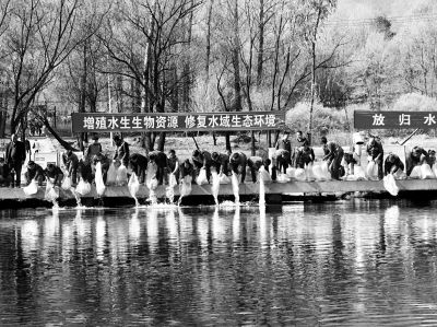 秋日的古城河畔,水面开阔、生机盎然,来自全国水生野生动物保护分会、北京市农业局、北京市环保局、延庆区农业局的负责人和社会各界人士近百人,将3万余尾瓦氏雅罗鱼撒向河流,刚刚投入古城河怀抱的鱼苗像是回到了自己温馨的家,兴奋地四散游开。