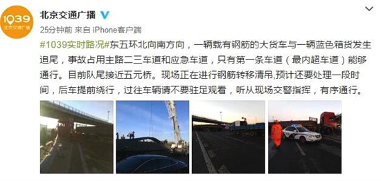 人民网北京10月30日电 据北京交通广播官方微博发布,东五环北向南方向,一辆载有钢筋的大货车与一辆蓝色箱货发生追尾,事故占用主路二三车道和应急车道,只有第一条车道(最内超车道)能够通行。目前队尾接近五元桥。现场正在进行钢筋转移清吊,预计还要处理一段时间,后车提前绕行,过往车辆请不要驻足观看,听从现场交警指挥,有序通行。