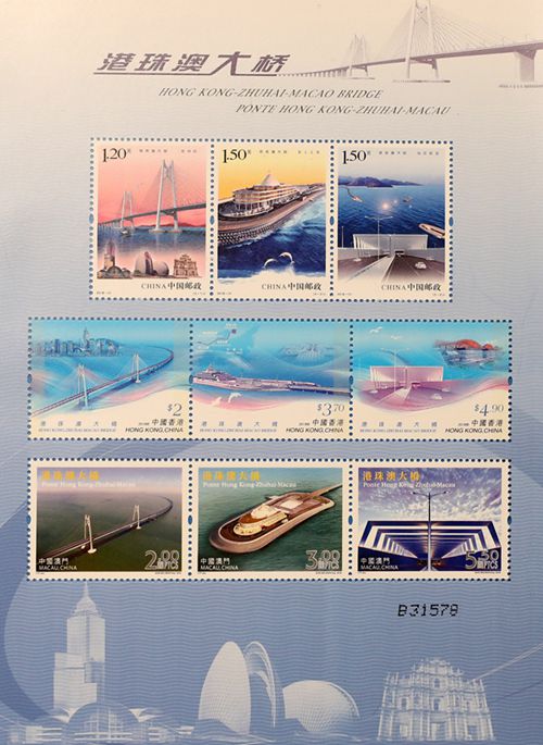 香港邮政,经理李振宇日前表示,这套特别邮票以大桥的中英文名称为设计,,这些字母和文字与背景的格线图案交织成细致网络,象征公路网络紧密连贯,促进粤港澳大湾区内各地融合。联合纪念套折邮票在形式上则既有三地鲜明特点,又具整体协调性,,收藏价值。