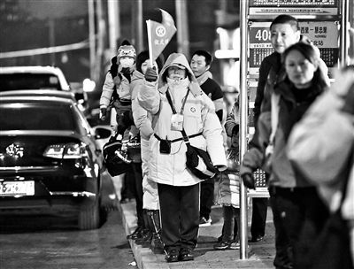 在公交车站提供服务的文明引导员 摄影/本报记者 郝羿