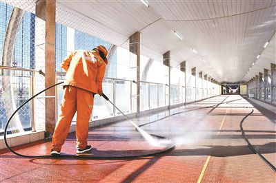 连廊开通前,保洁人员进行,的清洁工作 摄影/本报记者 黄亮