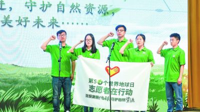 昨天是第50个世界地球日,市规自委举办主题宣传活动周启动仪式,“我的北京我来‘划’”科幻画征集活动先期展开。活动周期间,市规划展览馆将办“寻趣北京·地球嘉年华”系列活动,750平方米的展区设置了“游中轴”“构未来”“划北京”“玩科学”等主题展。图为启动仪式现场,志愿者代表宣读“珍爱美丽地球 守护自然资源”倡议书。本报记者 邓伟摄