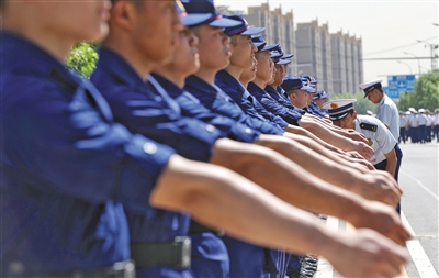昨日上午,记者来到位于北京市大兴区的北京消防训练基地,看到新消防员正在顶着烈日训练。沥青路面散着热气,训练场上口令、号子声此起彼伏。训练场边,退伍军人董兴华给新人“开小灶”。“你的膝盖不要弯,你要提胯,脚不要拖地。”董兴华一个细节一个细节地指导着转体动作的要领。类似的“老兵带新人”的训练场景在训练场并不少见。
