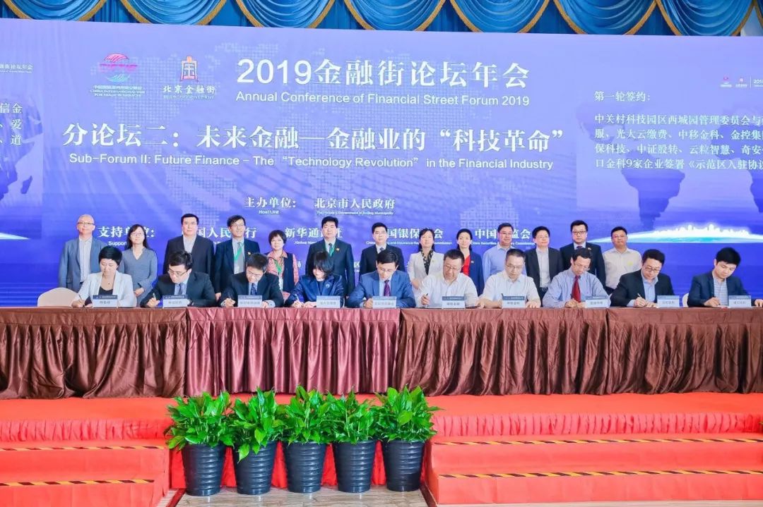随后,在北京市金融监管局、人民银行营管部、北京银保监局、北京证监局、西城区政府、海淀区政府等领导的共同见证下,西城区政府副区长贾蔚与建信金服、光大云缴费、中移金科、金控集团、爱保科技、中证股转、云粒智慧、奇安信、道口金科9家企业签订入驻协议。