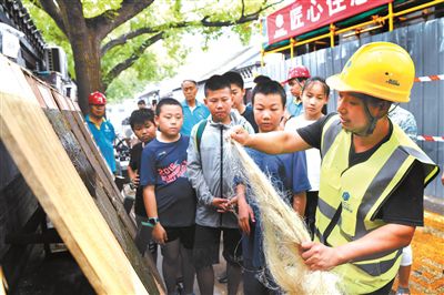 施工人员向小学生展示文物修缮的“使麻工艺技法”摄影/本报记者 魏彤