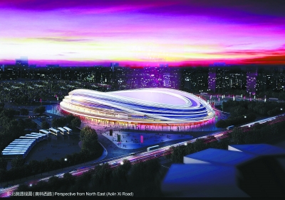 以“冰丝带”为设计理念的国家速滑馆东北侧透视图。