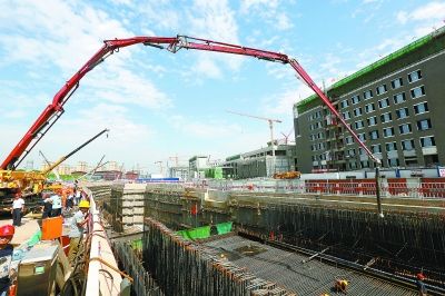 昨天,示范段进行首仓封顶混凝土浇筑,这标志着副中心难度最大的综合管廊区段进入阶段性工程节点。本报记者 饶强摄