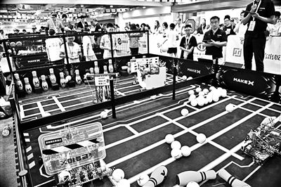 集结全世界青少年智慧和创造性的智能机器人昨天同台竞技,在世界机器人大会的赛场上现场打擂。一大早,从世界各地赶来参与比赛的选手已经进入场馆开始准备。在最先拉开比赛大幕的“攻城大师”资格赛上,只见几平方米的比赛擂台上,摆放着不同色彩与分值的保龄球,根据规则,小选手们设计的机器人将通过各种办法将球掷向保龄球,得分多者胜。据该项赛事品牌方Makeblock介绍,目前进入决赛的有80支队伍。总体来看,比赛分为两个阶段,第一个阶段是自动环节,将体现小朋友的编程能力,也就是控制“比赛机器人”;第二个阶段是手动环节,需要小朋友通过手柄操作,体现机械结构的科学性。