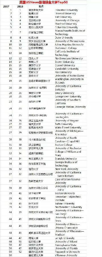 在U.S. News2017美国大学综合排名中,TOP50的学校与去年相比变化并不太大,前三甲依然是由普林斯顿、哈佛和耶鲁三巨头稳稳霸占。不过芝加哥大学今年强势突围,挤进前三,狠心滴把去年和她并列第四的斯坦福和哥大挤到第五的位置。而在这些排名靠前的名校中,对雅思成绩的要求都比较高,因此,相对来说,拥有雅思高分更有希望进入名校。下图是2017美国大学综合排名榜单中前50位学校的排名情况,准备留学美国的学生可以看一下,里面是不是有你心仪的大学呢?