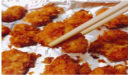 3、将薯片压碎,再让鸡块沾上薯片碎片