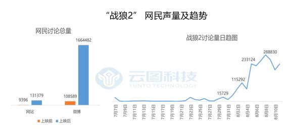 我们再来看看它的网络口碑情况。放映前,网民在传统媒体的讨论量达10K,在微博的讨论量达131K;放映后,激起了“吃瓜群众”的广泛讨论,传统媒体讨论量达109K,微博讨论量达1664K。相对于放映前, 战狼2的讨论量几乎直线上升。伴随着影片不断升温,从上映第一天开始,秒杀同期影片,连续拿下21个单日票房冠军。在8月19日,总票房突破50亿大关,挤进世界TOP100,创造了一个新的票房奇迹。