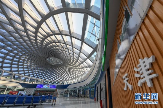 这是坐落于天津滨海新区中心商务区的于家堡高铁站(9月17日摄)。京津城际铁路天津站至于家堡站开通后,与运营的京津城际铁路北京南站至天津站实现无缝连接,可满足旅客从北京到于家堡中心商务区间往返直达运输需求。新华社记者 白禹 摄
