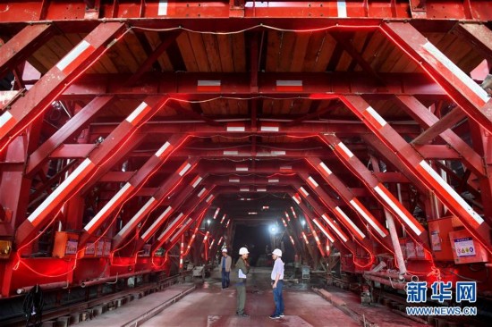 工作人员在京张高铁北京八达岭长城站内施工(8月8日摄)。京张高铁八达岭长城站是京津冀交通重点工程,被称为“世界最深高铁站”。新华社发(李文摄)