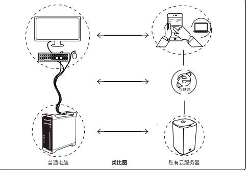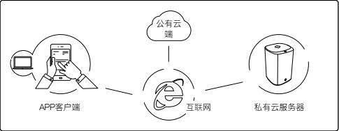 如果用类比方式来理解先河私有云的话,私有云服务器相当于没有屏的电脑;APP客户端相当于这台没有屏的电脑的远程桌面,用户通过APP客户端访问私有云服务器,不同用户之间则可通过APP客户端进行沟通,不同用户的私有云服务器亦能交互;公有云端提供公共平台、连接、云计算基础和增值服务。