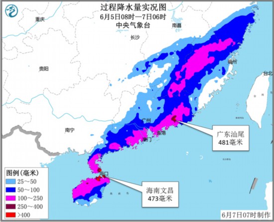 受其影响,7日08时至8日08时,海南岛北部、广东中西部、广西东部以及湖南东南部、江西西南部等地有大到暴雨,其中,广东西南部和沿海的部分地区有大暴雨,局地有特大暴雨(250~280毫米);上述部分地区伴有雷电、短时强降水和雷暴大风等强对流天气。