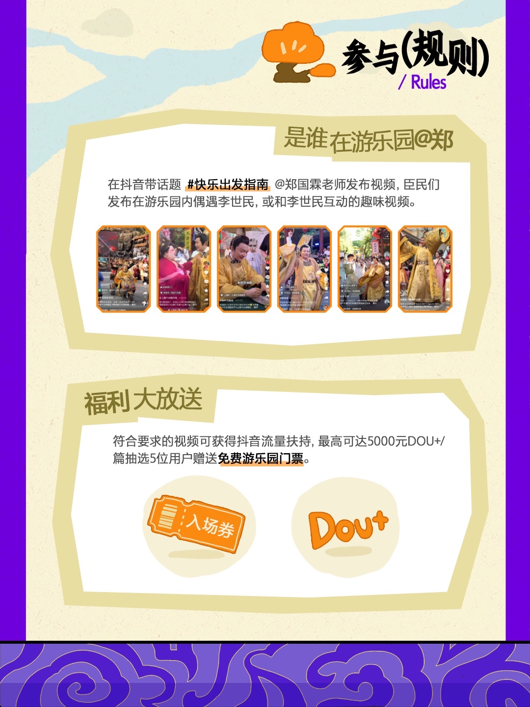 活动初期,通过郑国霖“李世民”巡游活动,激发用户“想去乐园偶遇明星”的出行意愿。同时,在抖音平台发起“郑在乐园等你来”活动,以DOU+及游乐园门票的双重激励,吸引用户主动搜索#快乐出发指南 话题并参与活动,发布在游乐园内偶遇“李世民”的趣味视频,让用户从“观众”变为“传播者”。