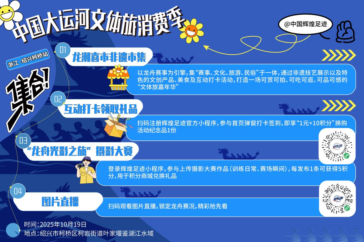 作为大运河文化带一颗璀璨的明珠,2025“行走大运河”——中国辉煌足迹大运河龙舟系列活动(浙江·绍兴柯桥站)于10月19日在绍兴市柯桥区柯岩街道叶家堰鉴湖江水域,收官。活动结合《“跟着赛事游浙里”赛事活动2025年柯桥区第九届运动休闲时尚周暨2025年“鉴湖杯”第四届浙江省龙舟精英赛》举办,让龙舟飞桨激荡起鉴湖的千年记忆,将体育精神与绍兴风情,交融,呈现了一场独具越地风情的秋日水上盛会。