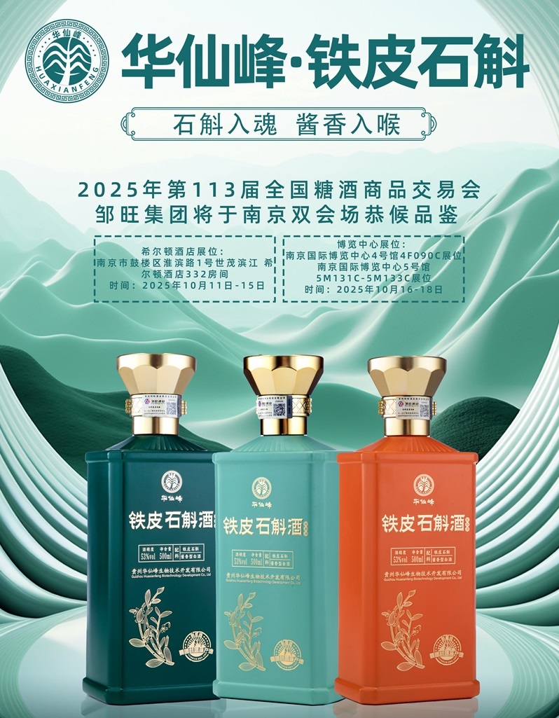 在今年的秋糖,贵州邹旺酒业集团的展位前始终人头攒动——一边是“邹六福”“中福台”等传统酱香产品吸引老酒客上前品鉴,一边是“华仙峰铁皮石斛酒”让嘉宾好奇驻足。