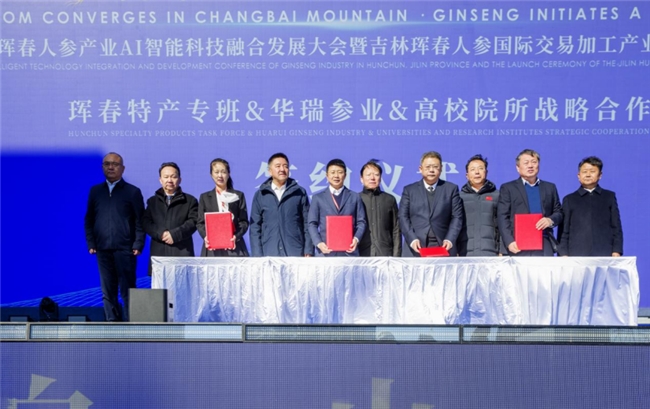启动仪式上的三轮战略合作签约成果斐然。珲春特产专班、珲春华瑞参业生物工程股份有限公司与长春中医药大学吉林省人参科学研究院、吉林农业科技学院等高校院所签订了技术战略合作协议;华瑞人参酒、吉参乐人参植物饮料正式签约入驻珲春人参国际交易加工产业园区;“米梁源”AI人工智能销售平台与全国近200家代理进行了集中签约,覆盖四川、浙江、陕西、新疆、河北、宁夏、重庆、湖北、海南、北京、甘肃、广东、黑龙江、山东、江苏、山西等多个省份,构建起线上、线下相结合的营销网络。