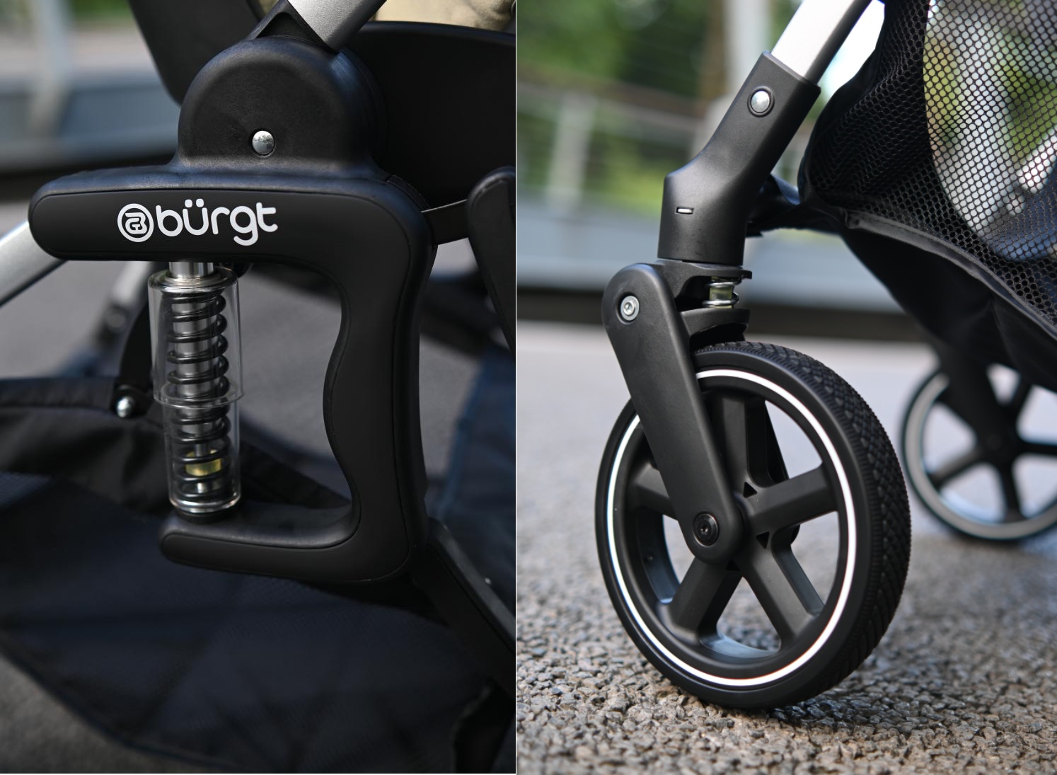 - 避震性能:推行时的平稳度很重要,平稳舒适是宝宝爱坐的第一要素。专业避震器+四轮弹簧独立避震优于轮胎减震;车架结构优选柔性结构,尽量选择坐兜颠簸冲击感少的款型。