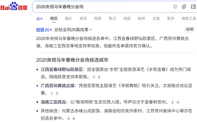 鉴于2024、2025年疫后恢复的春晚会场对地方城市曝光量、知名度的巨大提升和对地方经济显著的带动效应,2026年春晚将继续实行北京主会场+地方分会场模式,并且在去年基础上增加了1个地方分会场更大力度打造城市新,,江西袁州《乡愁宜春》剧场、广西贺州昭平县黄姚古镇、“塞外雪乡”内蒙古赤峰山戎部落、“苏超”顶流江苏常州奥体中心、湖南岳阳农民作家村“象棋村甲”会场、海南三亚西岛目前网络民意支持,。